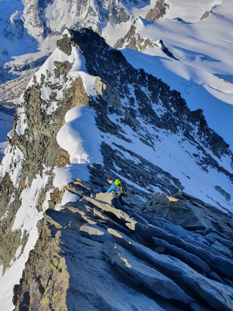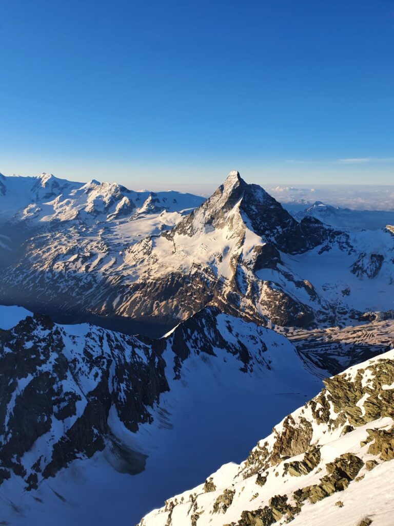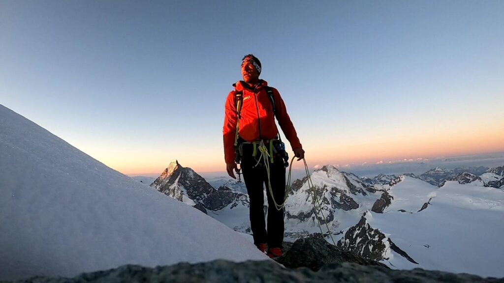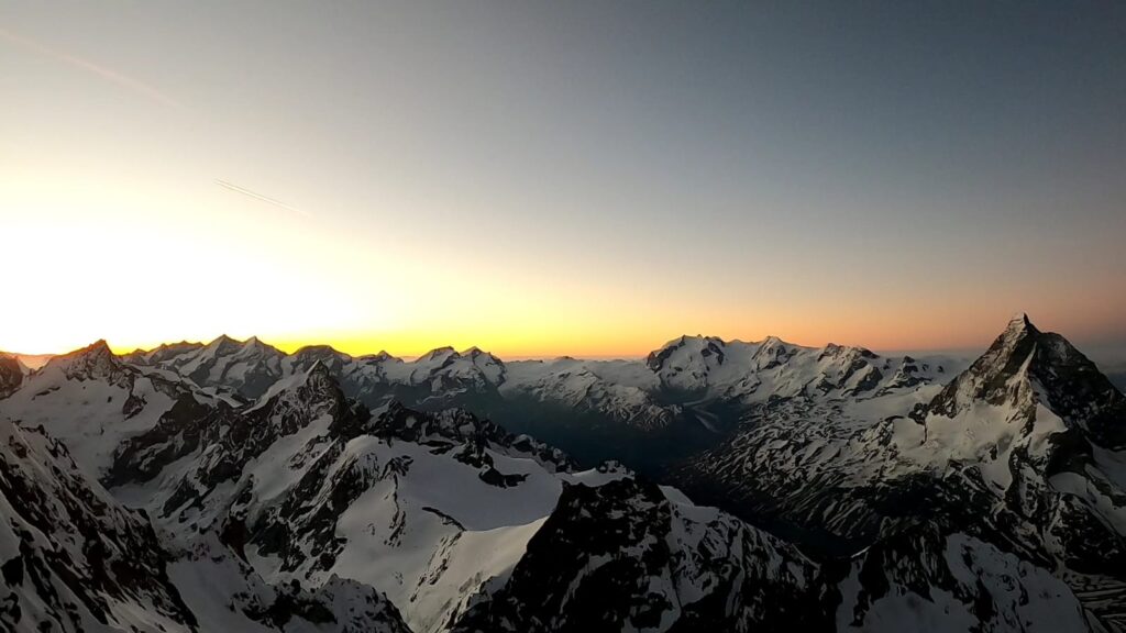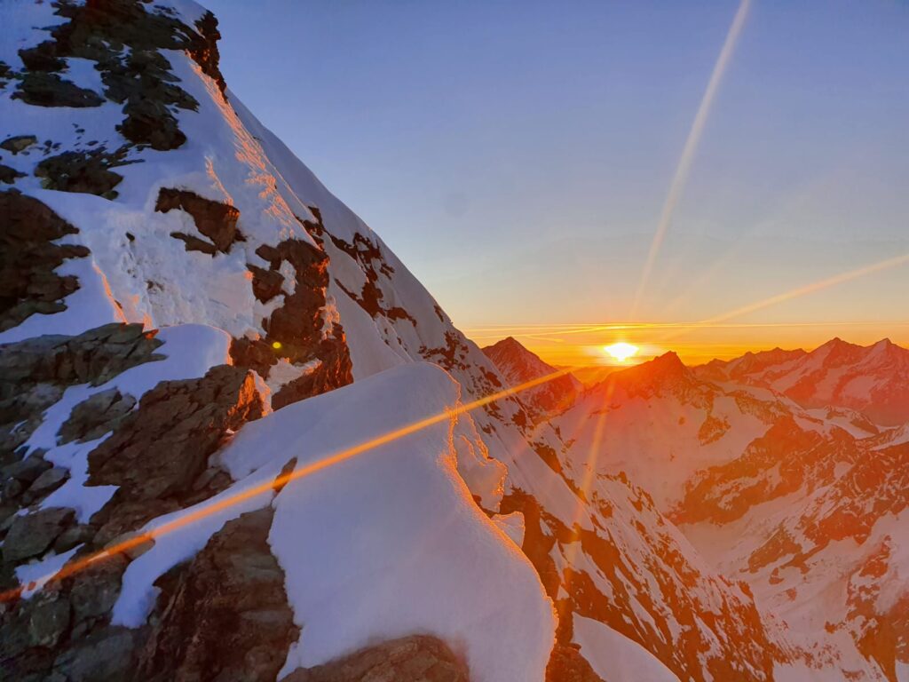 La parte finale diminuisce di difficoltà e riusciamo quasi a correre, mentre l’alba illumina il Cervino, colora i ghiacciai e ci accarezza dolcemente.