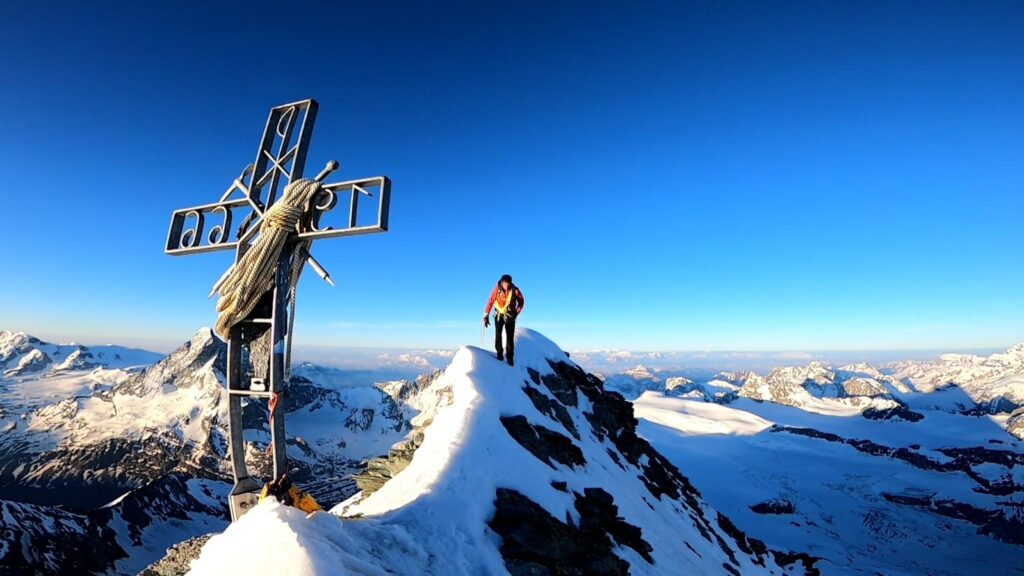 Isolata tra i ghiacciai, maestosa nelle sue forme, con quattro creste rocciose che raggiungono la vetta dove si innalza una croce magnifica, ornata con corda e piccozza…