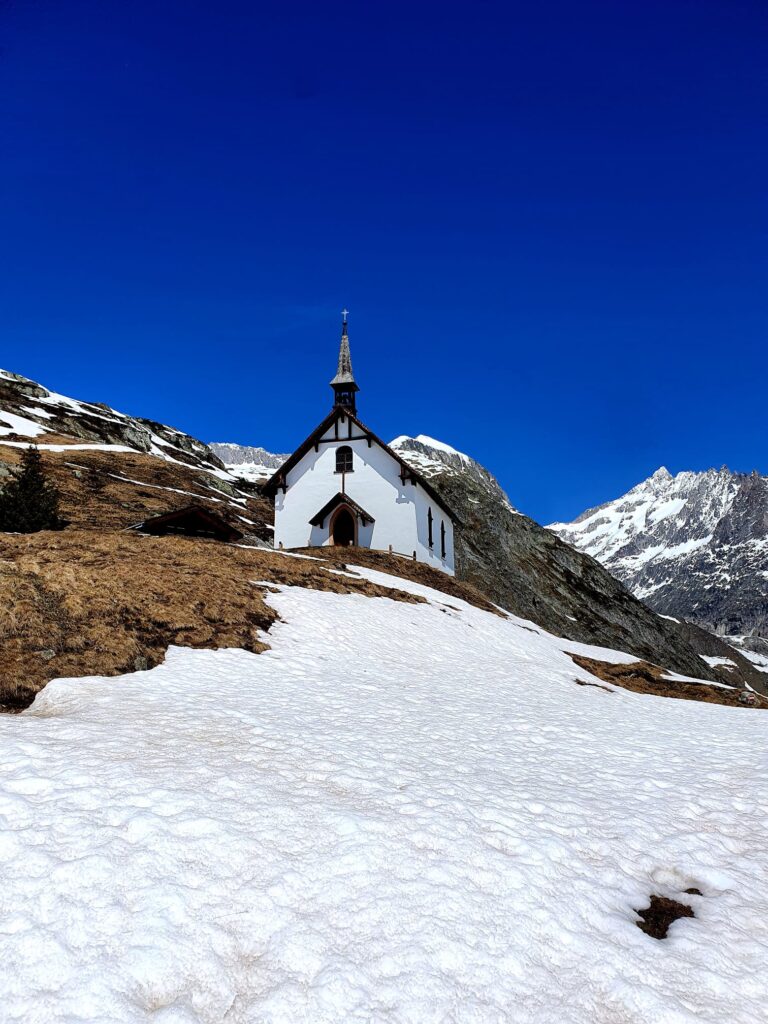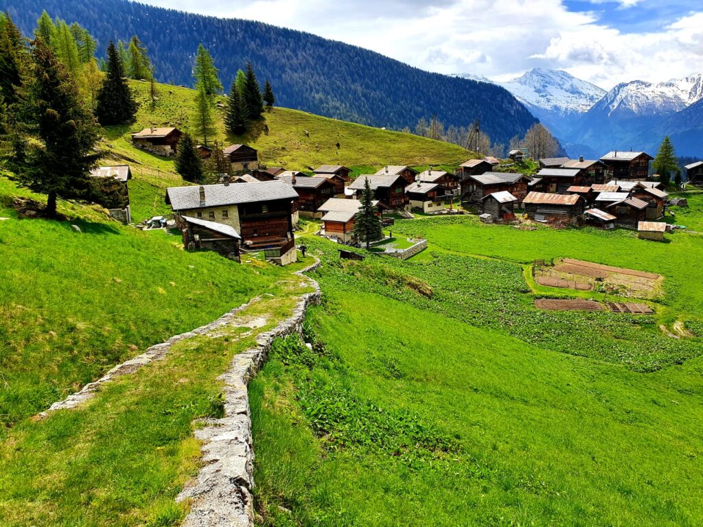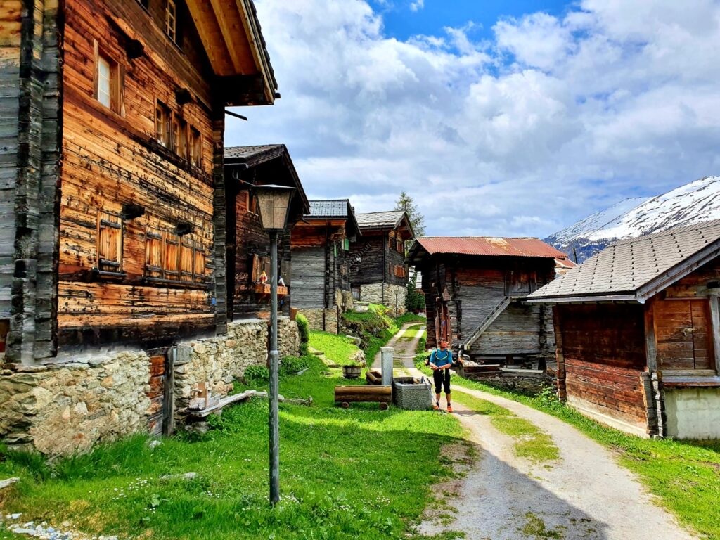 Prendiamo una funivia per alzarci di 400m di dislivello dal paesino di Blatten fino a Belalp. Ci troviamo su dei verdi pascoli, qua e là casette in legno più o meno rustiche, la neve è presente dai 2000m in su e iniziamo a camminare.