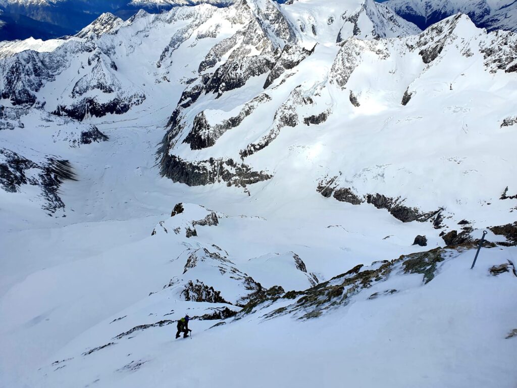 È prestissimo, arriviamo allo sperone sud-ovest e siamo quasi increduli che l’Aletsch sia già lì. Togliamo gli sci e saliamo un ripido canale per rimontare a quota 3700m.