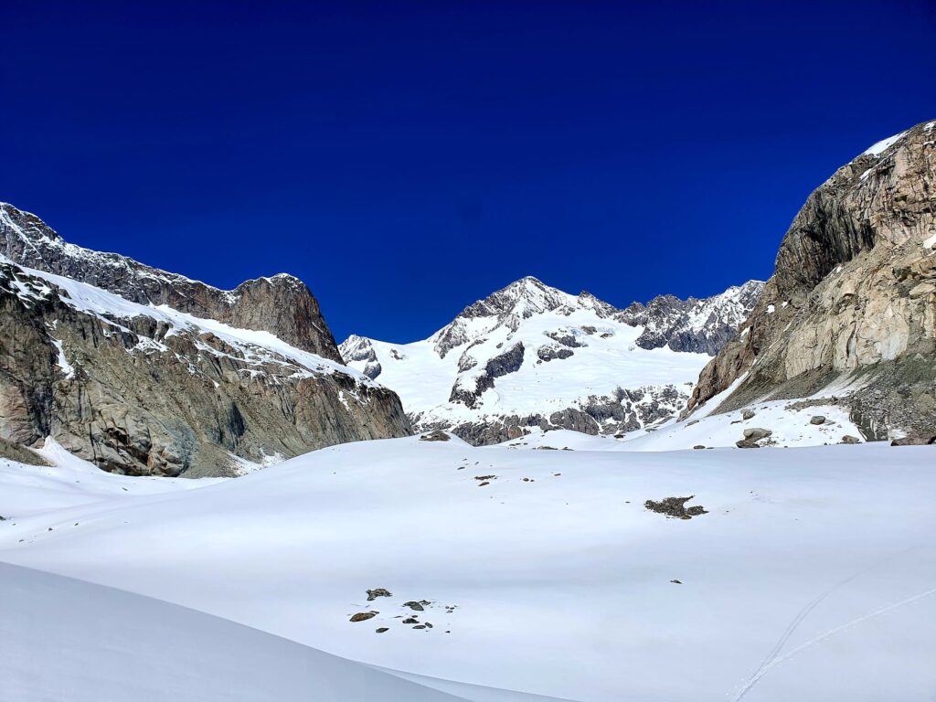 Una volta alla fine del ghiacciaio, sci sullo zaino e giù verso Blatten, tra i verdeggianti pascoli svizzeri, le magnifiche casette in legno e 3000m di discesa.