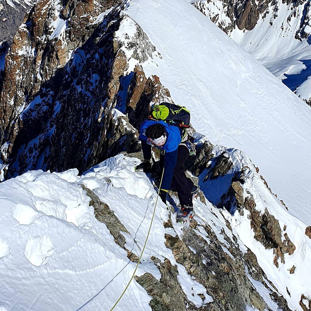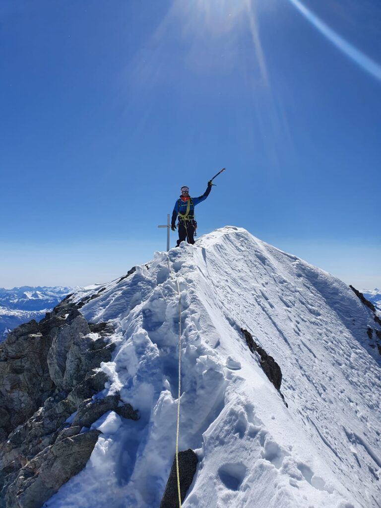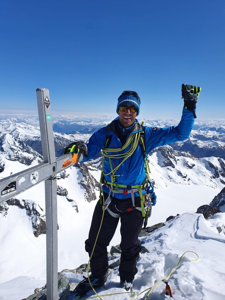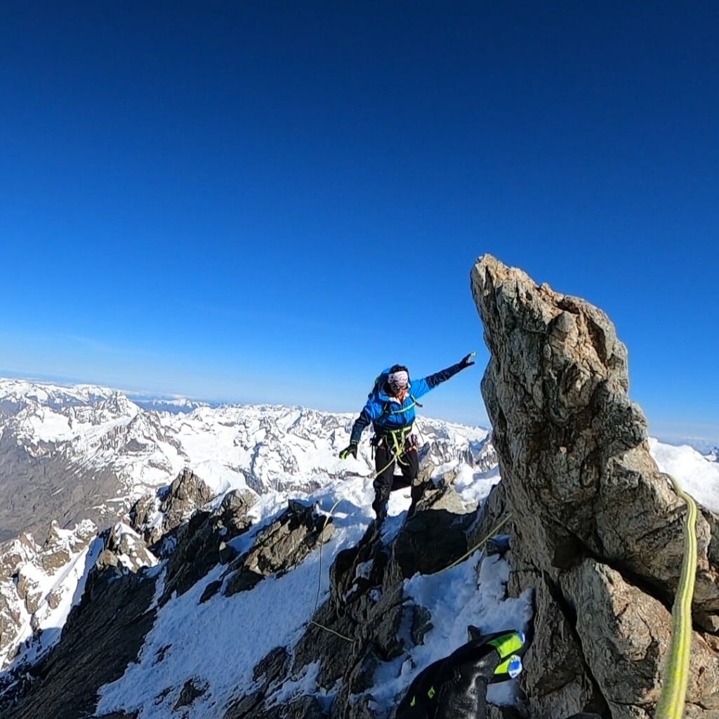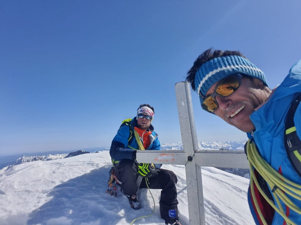 Alle 10 siamo alla croce di vetta a 4102m, il panorama è a dir poco incredibile, un infinita distesa di guglie, cime rocciose e vette innevate ci appagano della salita.