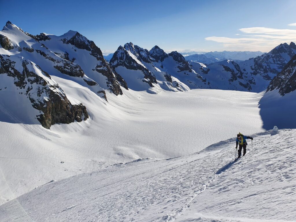 Saliamo senza fermarci fin sotto la terminale della Barre, qui il pendio è molto ripido, il grande accumulo è ben visibile, prendiamo le distanze uno con l’altro e percorriamo il margine della terminale cercando di non infastidire troppo il pendio.