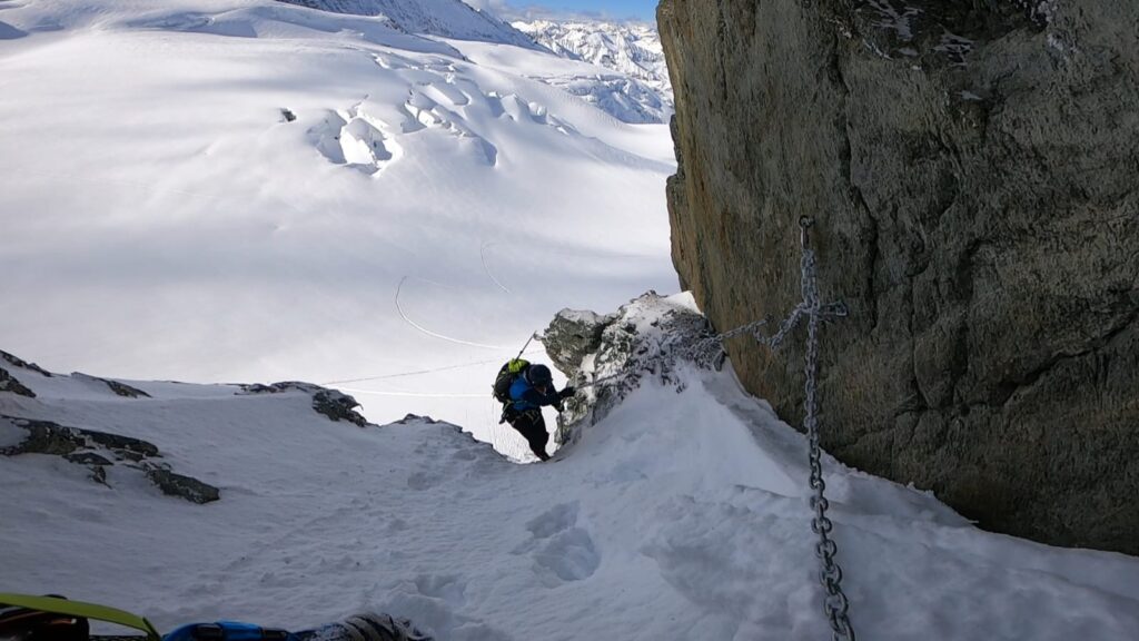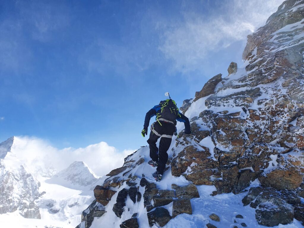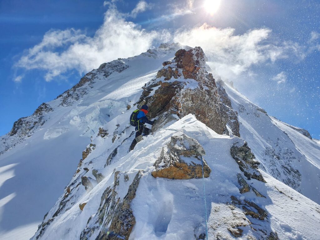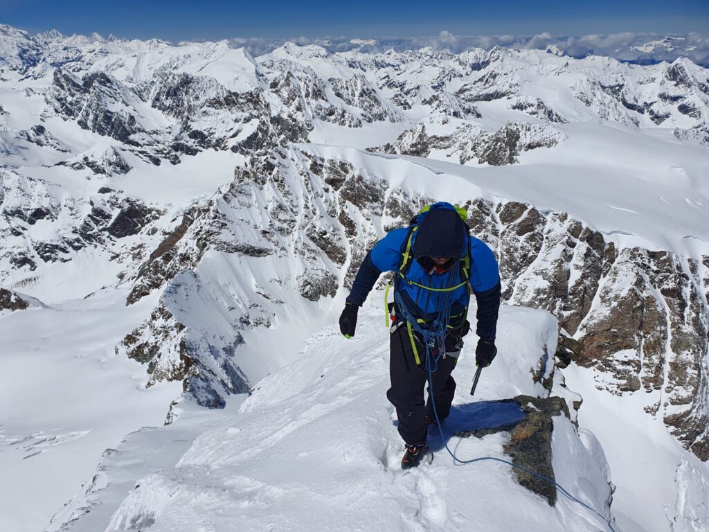 Tratti di cresta delicati e sospesi nel vuoto ci portano in cima. Difronte a noi la Dent Blanche e il Cervino dominano i ghiacciai.