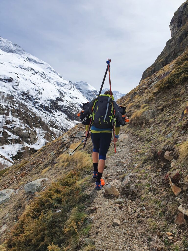 I 13km che separano il parcheggio dal Rifugio Aosta paiono interminabili, la valle di ingresso è lunga e piana, le macchie di neve sparse qua e la, a causa della copertura nuvolosa, non hanno rigelato e si sfonda.