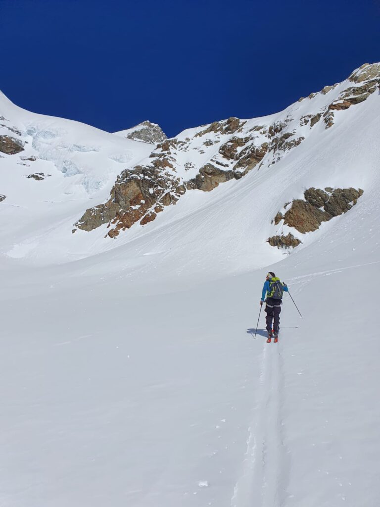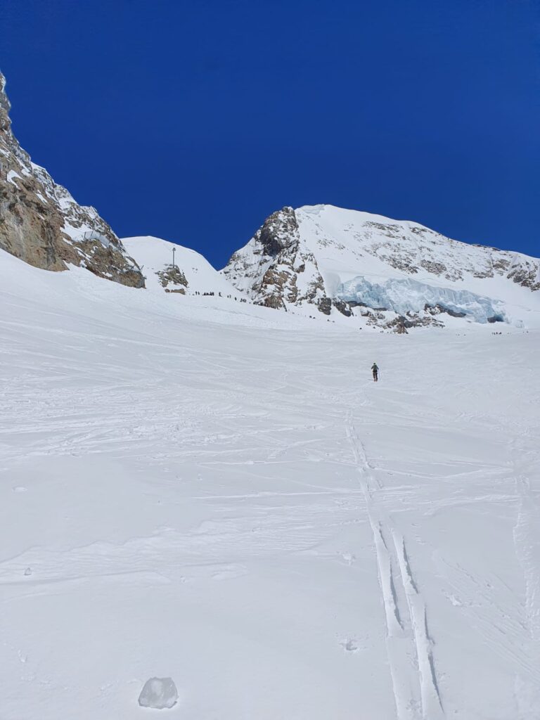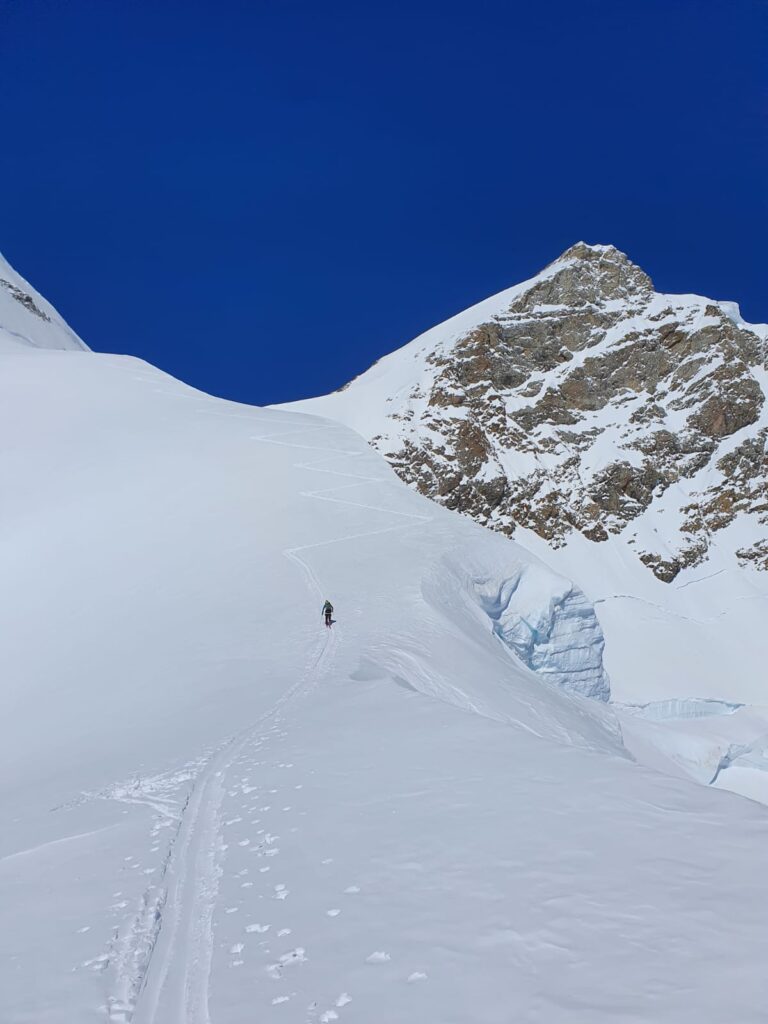 Puntiamo verso la Jungfrau, nonostante l’ora (ormai sono le 10), la neve è ancora ben portate. Seguiamo la bellissima traccia che rimonta una serie di pendii fino al Rottalsattel.