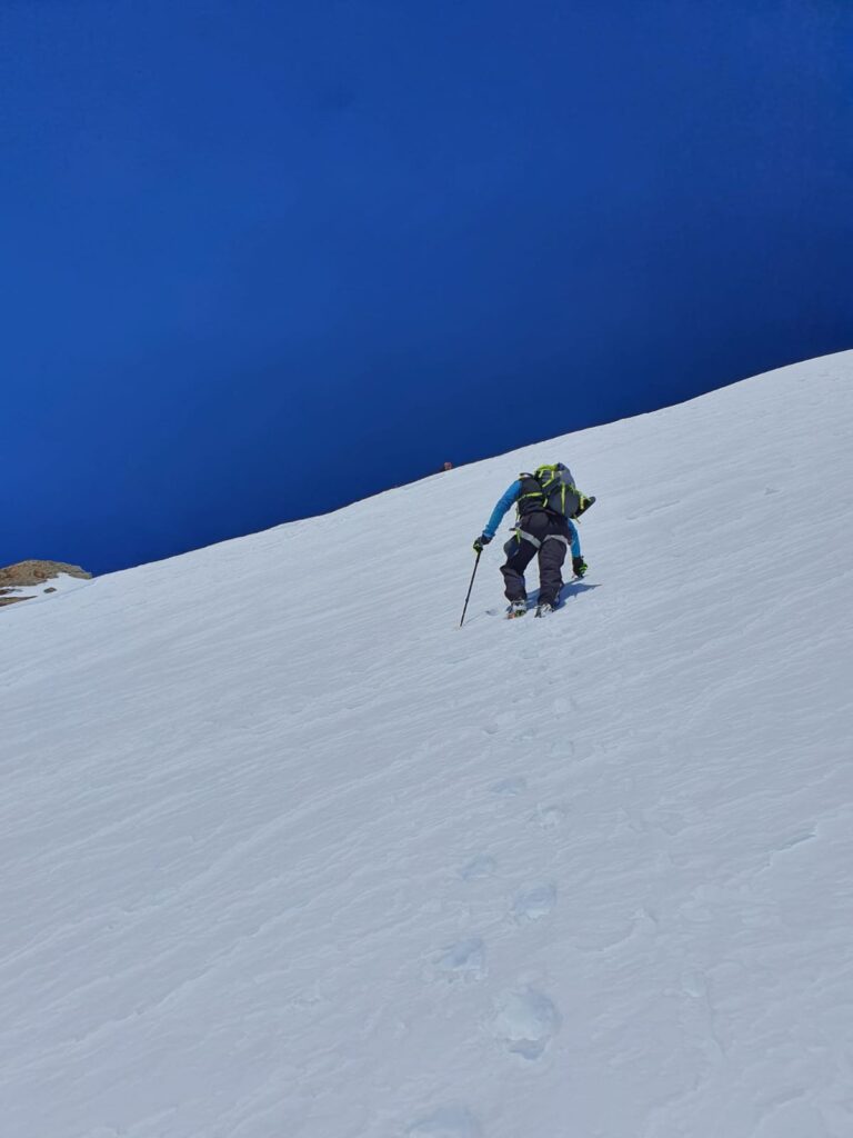 La neve si rivela perfetta, la traccia è super, una fila di gradini, rimontano il filo di cresta.