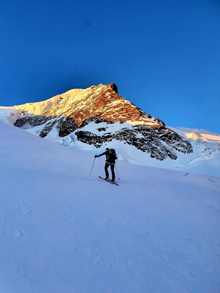 Saliamo fino al Buuch, quota 3225m, dove ci abbassiamo un 60-70m di dislivello, per immetterci nella lingua centrale del ghiacciaio, proprio sotto il Bernina che all’alba si colora di giallo oro.
